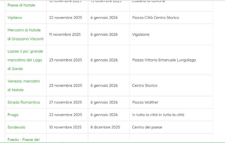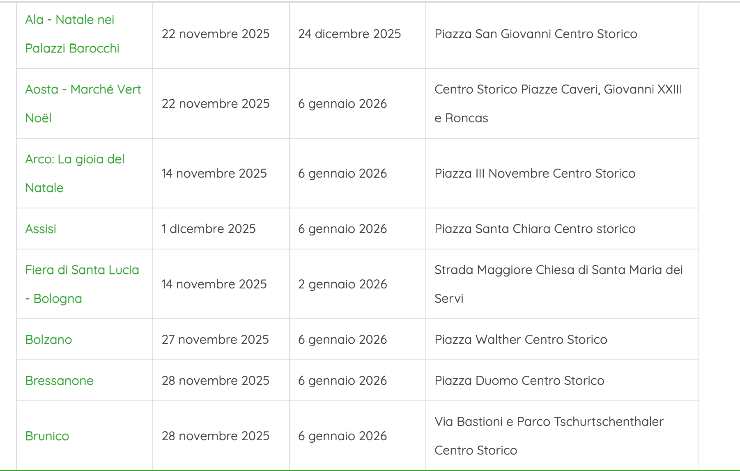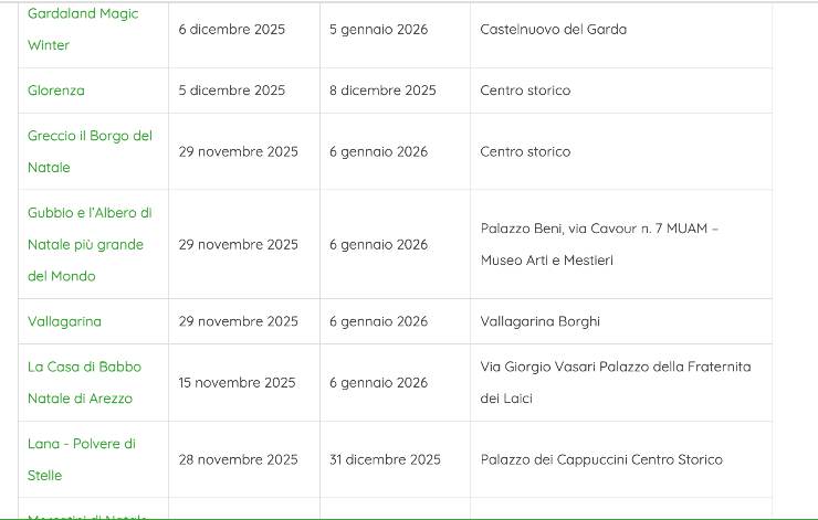 A Gubbio invece dal 29 novembre 2025 al 6 gennaio 2026 presso il Palazzo Beni in Via Cavour troverai esposto presso il Museo Arti e Mestieri l’albero di Natale più grande al mondo. Come ti dicevo è impossibile fare un elenco completo, ma ti fornisco alcuni screenshot dell’elenco aggiornato presente sul sito mercatini-natale.com. Non ti resta che prenotare subito la tua vacanza!
